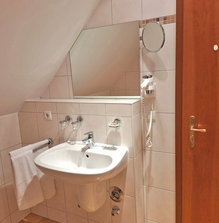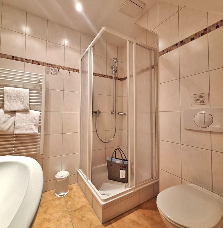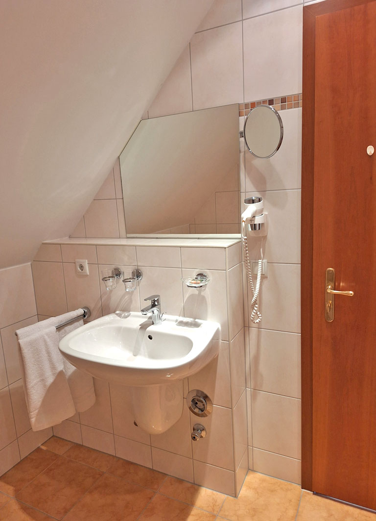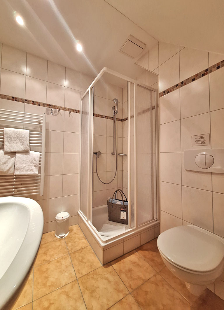 Das Schlafzimmer mit Doppelbett befindet sich im oberen Bereich, ebenso das Badezimmer mit Dusche, WC, Kosmetikspiegel, Haartrockner, Handtücher